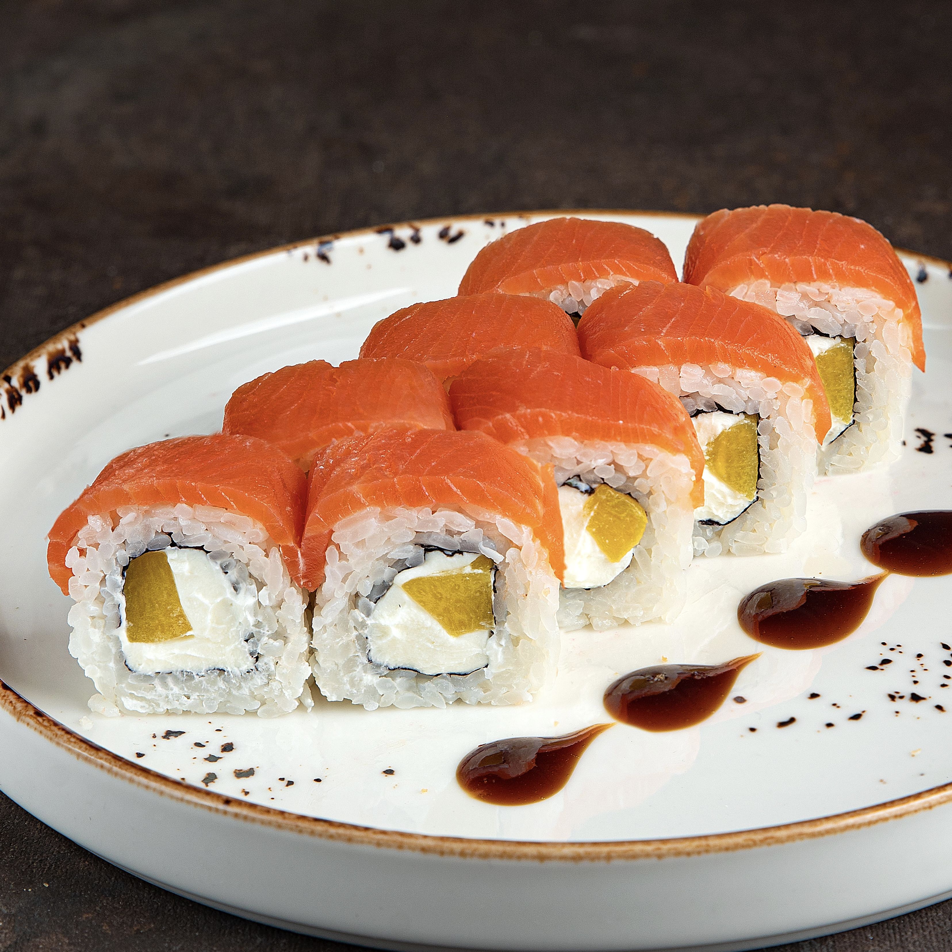 Нежное филе лосося, свежий огурец, нежное филе тунца, сливочный сыр